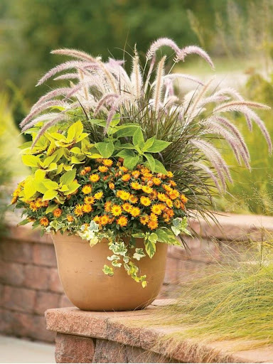 Geraniums, begonias, marigolds, and vinca are some of the well-known names in this category. The trailing plants that dangle over the side of a container to soften its edges are known as Spillers. Various types of ivy, dichondra, or golden creeping jenny will be a decent choice.